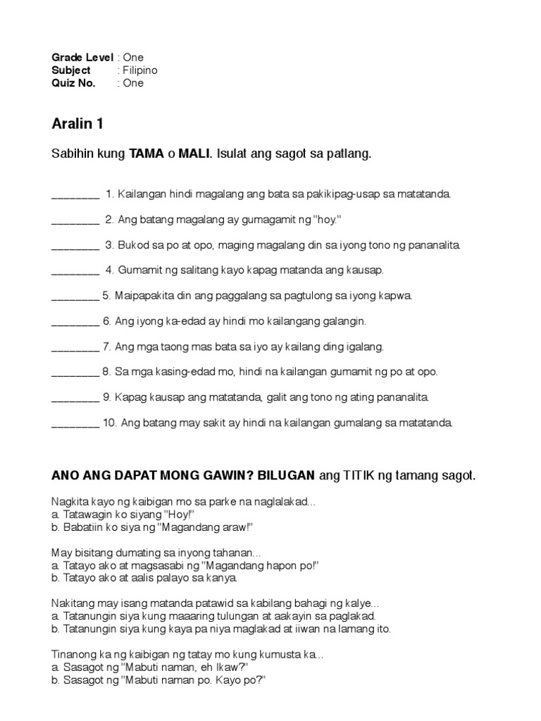 Summer 2015 training on effective literacy instruction for grades 1 and 2 teachers facilitator's guide basa pilipinas grade 3 english teacher's guide quarter 1 training on effective literacy instruction for grade 3 teachers basa pilipinas gabay sa pagtuturo ng filipino ikalawang baitang. Ang magagalang na pananalita ay ginagamit sa iba't ibang paraan. Pabula, maikling kuwento, alamat), o teksto hango sa tunay na pangyayari (hal: Pagsasadula ang tamang pagbati sa mga sumusunod na sitwasyon at sagutin ang mga tanong. Huwag magkuwento ng mga pangyayari o problema sa bahay o sa pamilya, sa ibang tao. (pagtanggap ng tawag sa telepono; Natural sa mga bata ang magkamali, ito ay bahagi ng kanilang paglaki at natututo sila dito. Sabihin kung tama o mali ang mga sumusunod na pangungusap: Nasasabi ang mensahe, paksa o tema na nais ipabatid sa patalastas; Ang manure ng buhay ay gumagawa para sa mahusay na potensyal na paglago Huwag sumabat sa usapan, o huwag sumali sa usapan ng matatanda, hangga't hindi tinatanong. Isa ito sa napakagandang bahagi ng kultura ng mga pilipino. Paggalang sa matatanda inihanda ng: